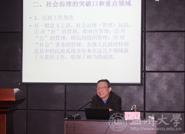 上午的报告会上,童星教授以网络治理为主线,围绕着“由管理到治理”、“管理倾向于采用科层制”、“治理需要网络型结构” 三个大方面分别进行了阐述。童教授凭借丰富的学术科研经验用简单易懂的话语、清晰明了的向我们介绍了管理和治理两大概念的异同、如何做到官民平等互信、网络协商民主及更好的实现信息公开共享。讲座过程中,童教授引用最新的诸如‘疫苗事件、异地高考、全面放开二胎的新政策’等我们所熟知的热点问题向我们详细介绍了网络型治理的优越性。下午的报告会上,童教授从十八届三中全会关于全面深化改革的总目标导入,进而探讨了推进社会治理现代化所具有的现实意义。童教授表示,治理是满足各种公的或私的个人和机构管理其共同事务的诸多方式的总和,与传统意义上的管理在主体、手段、实质、及内容方面有较大差异。随后,童教授探讨了社会治理的突破口和重点领域,提出从民政工作、政法委以及国家治理的三个角度着手开展。