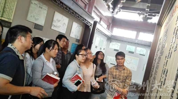 师生先后步入第五层、第六层进行了参观学习。他们为我们详细介绍了叶适的生平、经历和思想。叶适是南宋永嘉学派的集大成者和主要代表,是与朱熹、陆九渊“鼎足而三”的思想家。在宋代学术史上,叶适具有十分重要的地位。叶适的经世之学重典章、重经济、重致用,倡改革,又讲义理。“既无功利,则道义者乃无用之虚语”,其事功思想对后世之人产生了深远影响,已成为温州精神的重要内容。显然,温州人在改革开放中所展现出的敢为人先的探索精神、大力发展民营经济的创新创业精神及其善行天下的慈善精神,正是对叶适及永嘉学派经世致用思想的发扬光大。