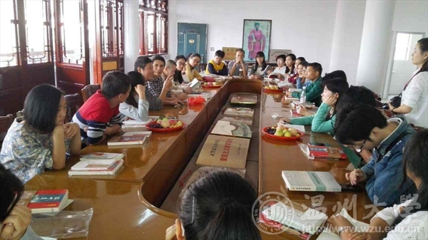 师生共24人到达叶适纪念馆。馆长叶文清老先生非常热情,他首先兴致勃勃地介绍了纪念馆的筹资建设及运营概况。纪念馆共六层,由于资金紧张,他们本着以馆养馆的思路,将1-3层对外出租,4层辟为接待处、办公室和会议室,5-6层通过文字、图片、塑像等介绍叶适生平、思想及永嘉学派的历史和影响。在会议室交流期间,叶馆长还给大家赠送了有关学术著作,同学们个个心满意足手捧“宝书”、津津有味地翻阅起来。