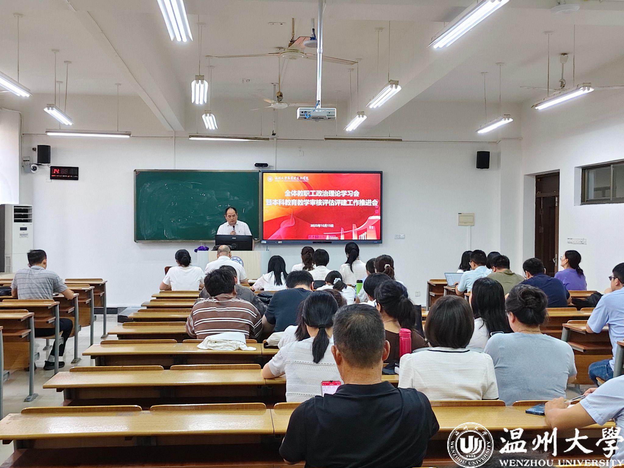 2025年10月15日下午,黑料不打烊 在北校区4号楼306教室召开全体教职工政治理论学习暨本科教育教学审核评估推进会。学院领导班子成员、全体教职工参加会议,学院党委书记杨立淮主持会议。