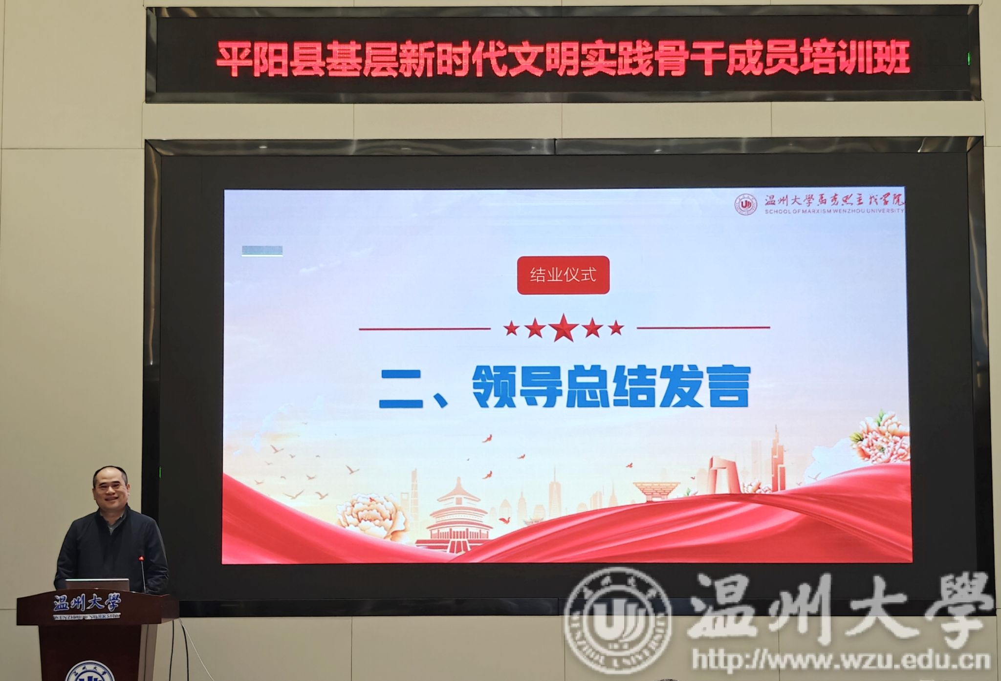 在结业典礼上,学员代表分享学习心得,表示将以此次培训为契机,切实发挥骨干作用,助力精神文明建设。杨立淮书记作总结发言。他强调此次培训契合党的二十届四中全会精神学习契机,平阳作为全国首批新时代文明实践中心试点县,肩负探索基层文明建设路径的重要使命,希望学员将所学转化为实践动能,深化理论武装、坚守人民立场、担当文明引领,在“文明平阳”建设中展现新作为。温从斌主任聚焦成果落地,要求学员以标准化建设为抓手,推动文明实践与基层治理、文明城市创建深度融合,打通服务群众“最后一公里”。