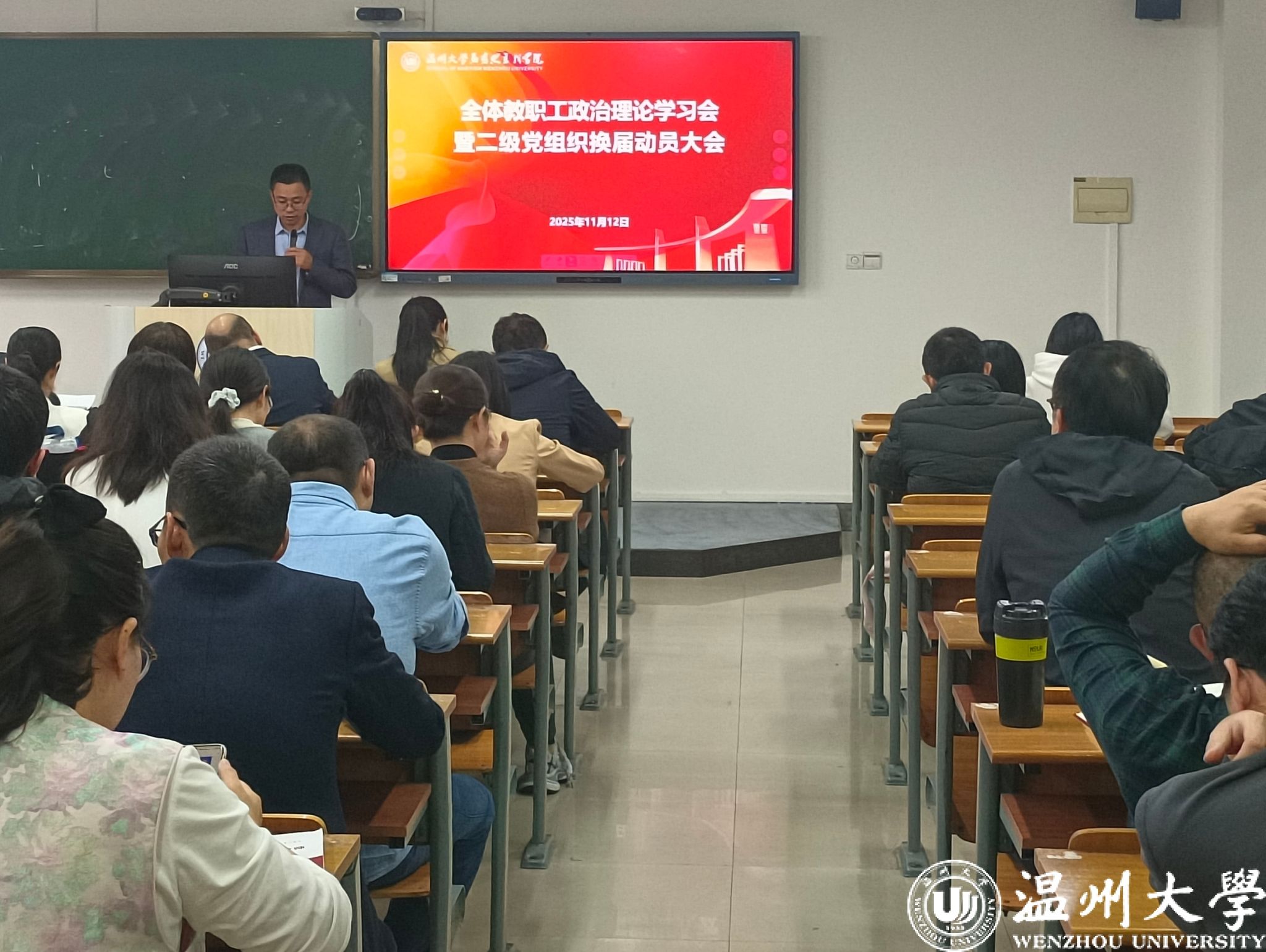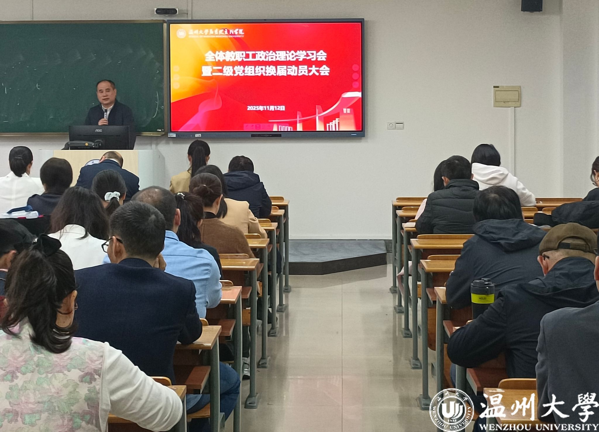 2025年11月12日下午,黑料不打烊 在北校区4号楼306教室召开全体教职工政治理论学习会暨二级党组织换届动员大会。学院领导班子成员、全体教职工和党员参加会议,学院党委书记杨立淮主持会议。