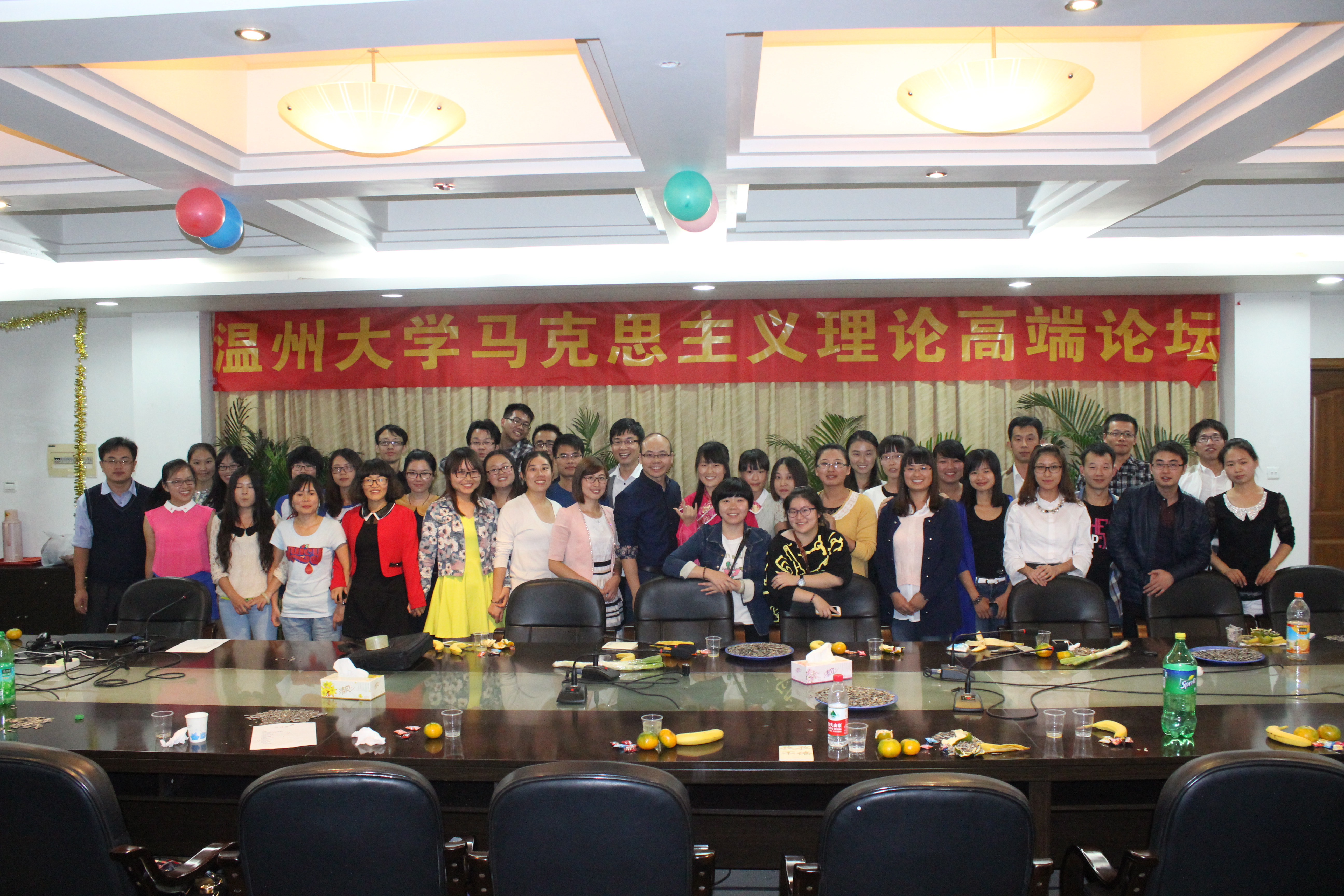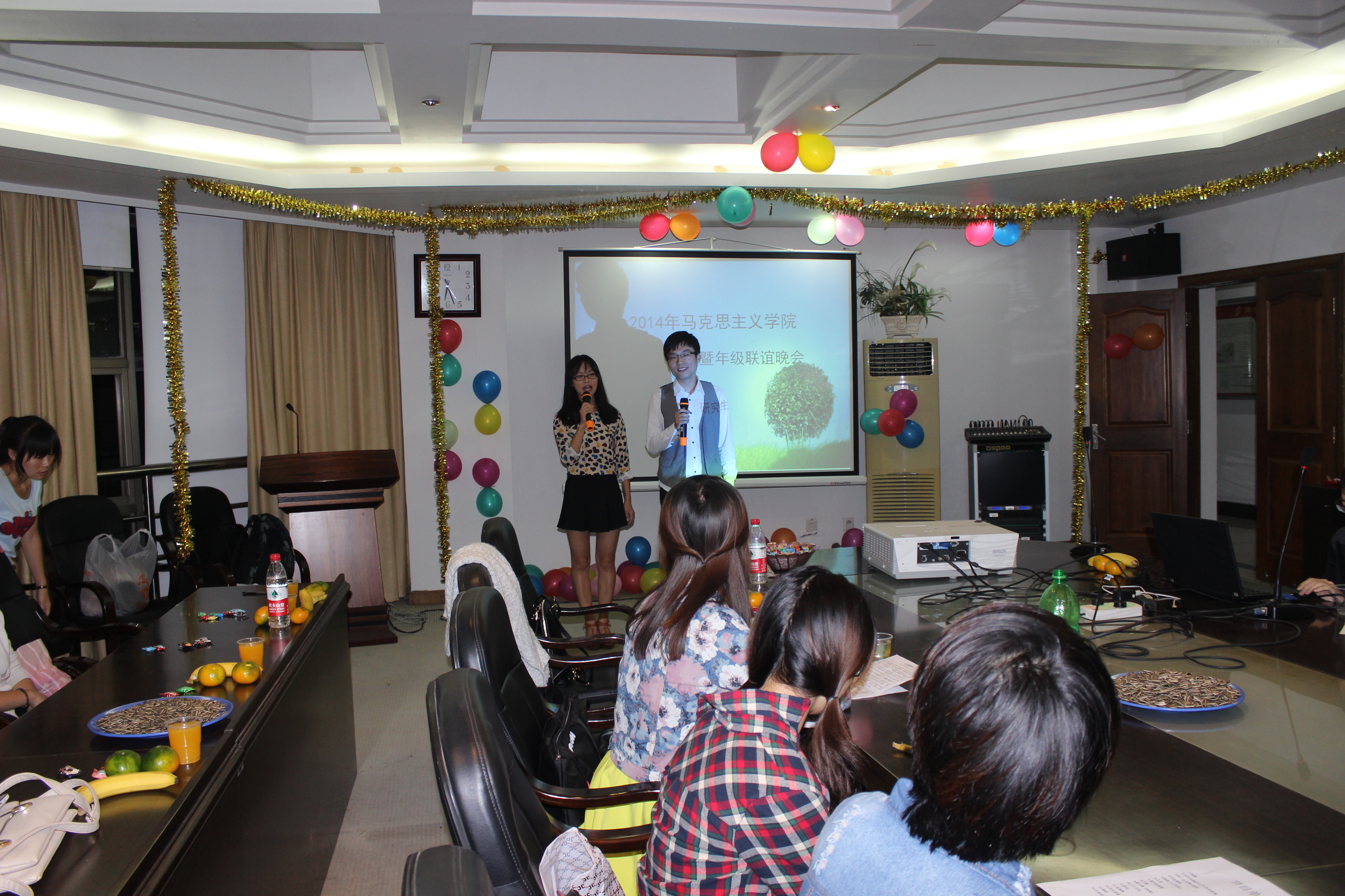 首先映入眼帘的是观众席上一张张纯真的笑脸,洋溢着马院学子的自信和阳光;舞台上五彩的气球将舞台装扮得异常温馨。节目还未开始,现场的气氛已十分活跃。跟随着动感十足的节拍,研一的美女们如阳光精灵般舞动起来,以此拉开了整场晚会的帷幕。随后,各种节目轮番登场,研一新同学带来的方言版诗朗诵《再别康桥》,不同年代的舞蹈《小苹果》、《惊鸿舞》、歌曲串烧给大家带来了阵阵欢声笑语,处处洋溢着青春的风采。卓院长更是以一曲《天路》震撼全场,引得同学们振臂欢呼。整场晚会持续了两个小时,在全体师生的阵阵笑语中圆满结束。