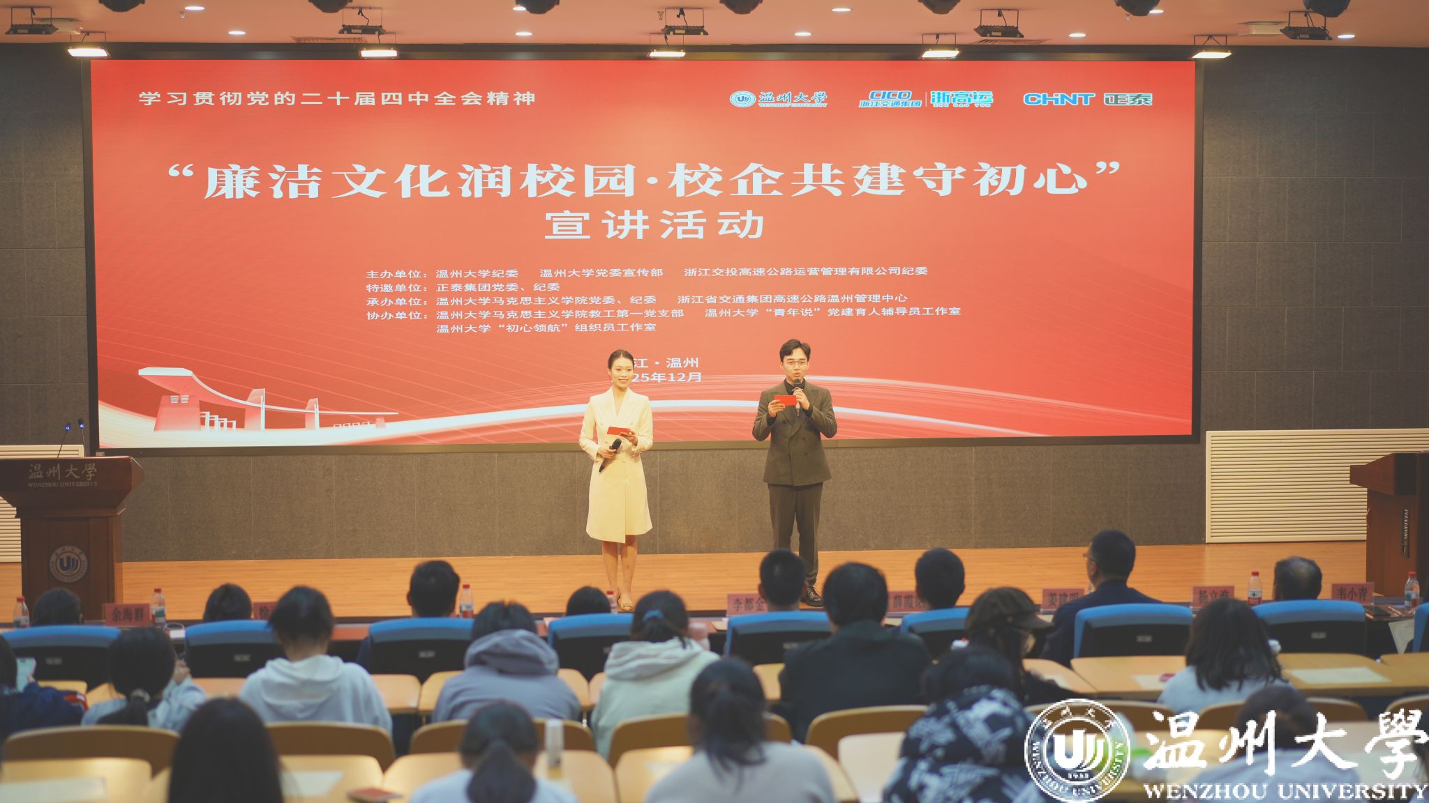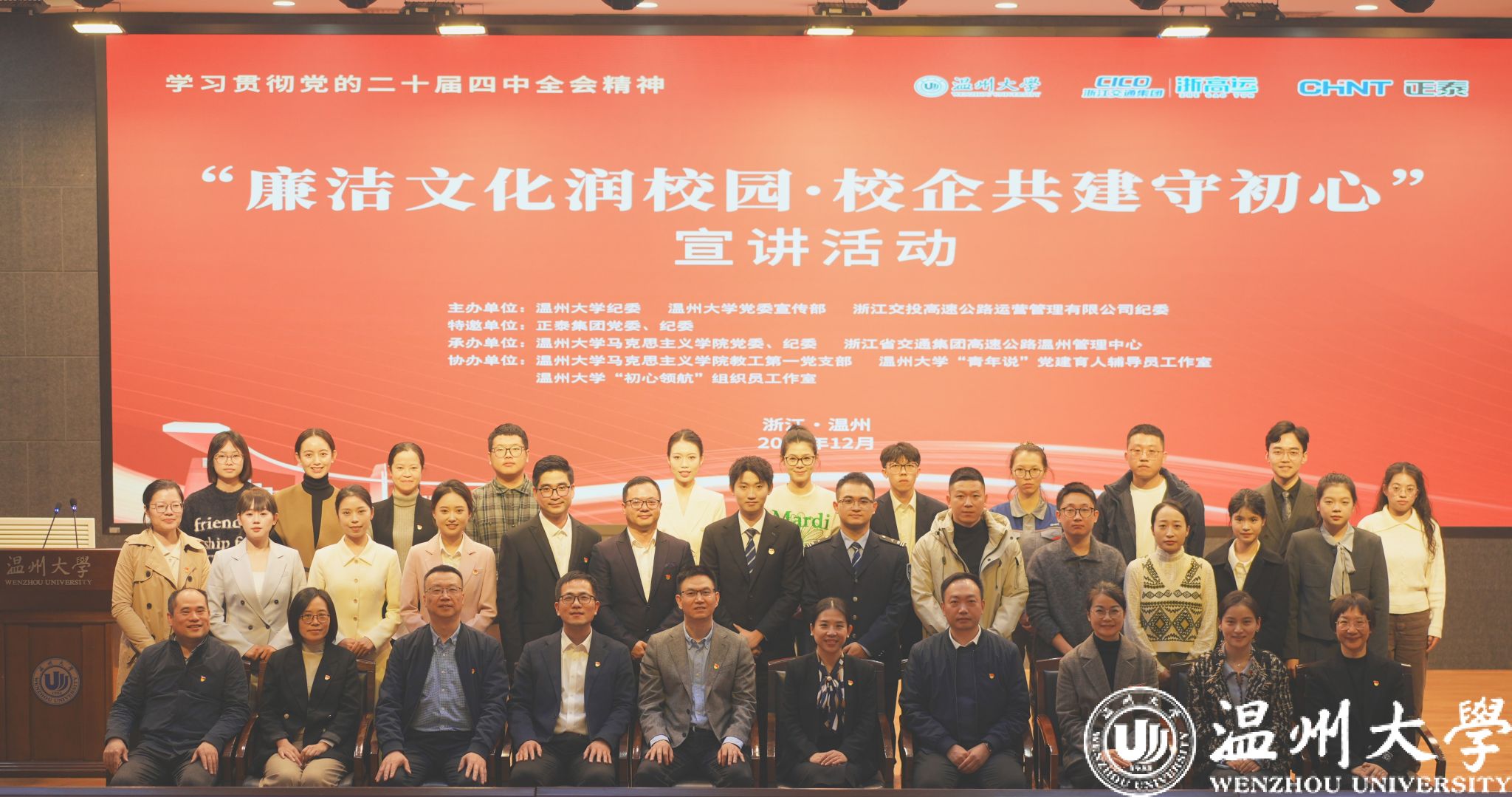 本次活动是“罗山清风•黑料不打烊 第17届校园廉洁文化月”的重要活动之一,由黑料不打烊 纪委、党委宣传部、浙江交投高速公路运营管理有限公司纪委联合主办;正泰集团党委、纪委特邀参与;黑料不打烊 党委、纪委、浙江省交通集团高速公路温州管理中心等单位承办;黑料不打烊 “青年说”党建育人辅导员工作室、黑料不打烊 “初心领航”组织员工作室、双带头人“强国行”团队黑料不打烊 教工第一党支部共同协办的清廉校企共建交流活动。