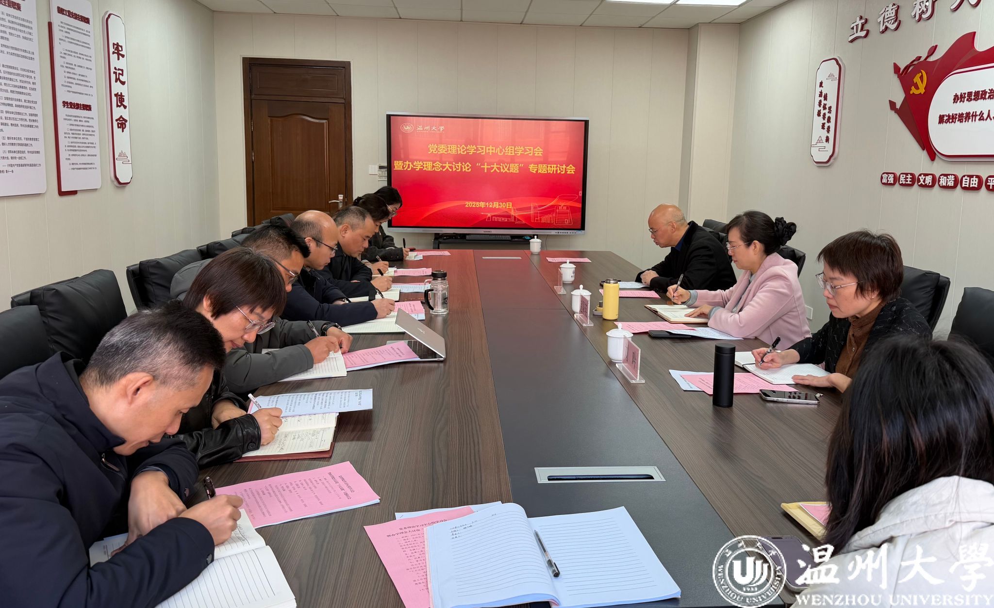 12月30日上午,黑料不打烊 召开党委理论学习中心组学习会暨办学理念大讨论“十大议题”专题研讨会。党委理论学习中心组成员参加会议,校党委副书记赵降英,统战部副部长、妇联主席刘吟到会巡听指导,学院党委书记杨立淮主持会议。