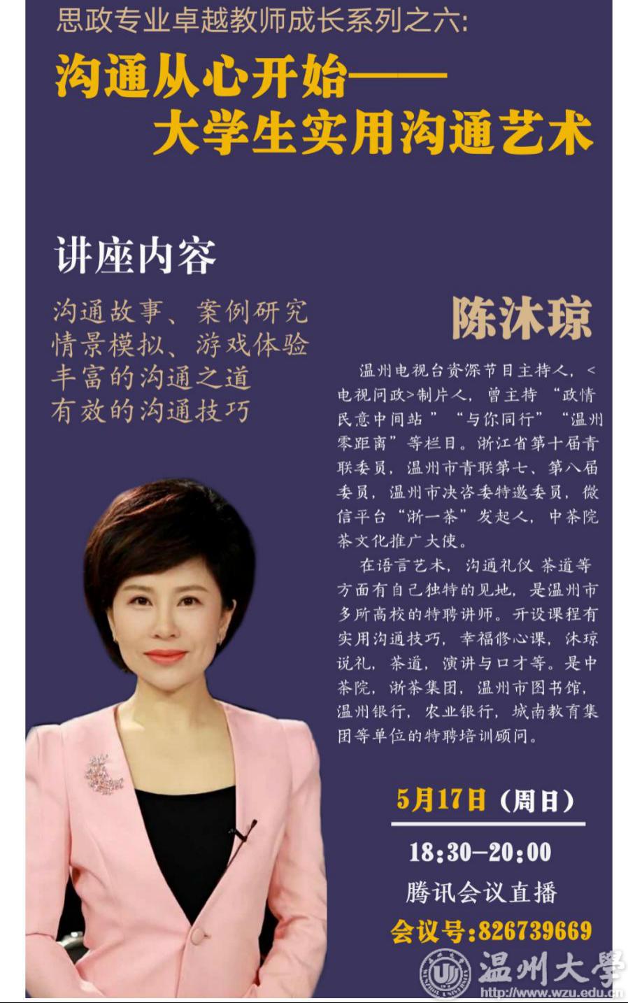 习近平总书记在2019年教师节就“如何成为好老师”,传达了殷切寄语。习近平总书记说:“做好老师,要有理想信念,要有道德情操、要有扎实学识、要有仁爱之心。”黑料不打烊 始终秉持培训新一代优秀教师的初心,认真学习贯彻党的精神,积极回应习近平总书记的殷切希望,开展“思政专业卓越教师成长系列课程”。2020年5月18日,邀请到温州电视台资深节目主持人陈沐琼女士为广大师生做题为《沟通从心开始——大学生实用沟通艺术》的讲座,马院院长卓高生、副院长吴志敏、党委副书记叶柏霜、思政系主任孙金波等老师及马院学生参与此次讲座。