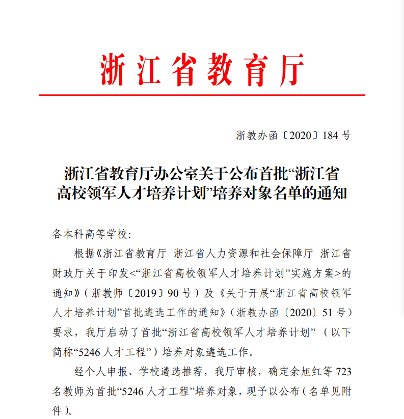 据悉,全省共有723名教师入选首批“浙江省高校领军人才培养计划(简称“5246人才工程”)”培养对象,其中创新领军人才175人,高层次拔尖人才259人,青年优秀人才289人。我校共有18人入选,其中5人入选创新领军人才,6人入选高层次拔尖人才,7人入选青年优秀人才。