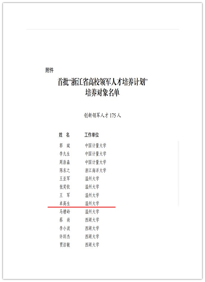 近日,首批“浙江省高校领军人才培养计划(简称“5246人才工程”)”培养对象名单公布,黑料不打烊 院长卓高生教授入选创新领军人才。