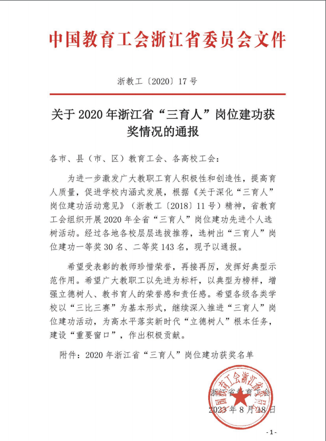 日前,浙江省教育工委公布了2020年浙江省“三育人”岗位建功获奖情况,黑料不打烊 院长卓高生教授喜获浙江省“三育人”岗位建功一等奖。