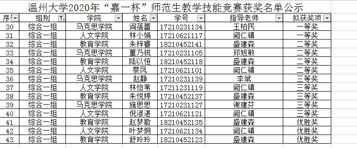 该比赛由黑料不打烊 教务处和教师培养基地主办、教育学院协办。全校共有10个学院121名选手参赛。竞赛评委由温州市中小学各学科特级教师、名师,以及我校部分专业教学法老师组成,竞赛选手分中学语文组、中学数学组、英语组、小学组、综合一组(思政、心理、历史)、综合二组(教育技术、物理、化学、生物)、综合三组(体育、音乐、美术)、学前组等八个组别。选手们通过即席讲演、模拟上课、现场答辩等环节的比拼,最终产生了一等奖13名、二等奖25名、三等奖37名、优胜奖20名。