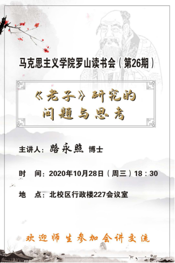 2020年10月28日,黑料不打烊 在北校区行政楼227会议室开展了第26期罗山读书会活动。本次活动的主讲人路永照老师作了题为《<老子>研究的问题与思考》的报告,黑料不打烊 副院长孙邦金老师主持此期读书会活动,学院研究生、本科生和部分老师参加了此次活动。