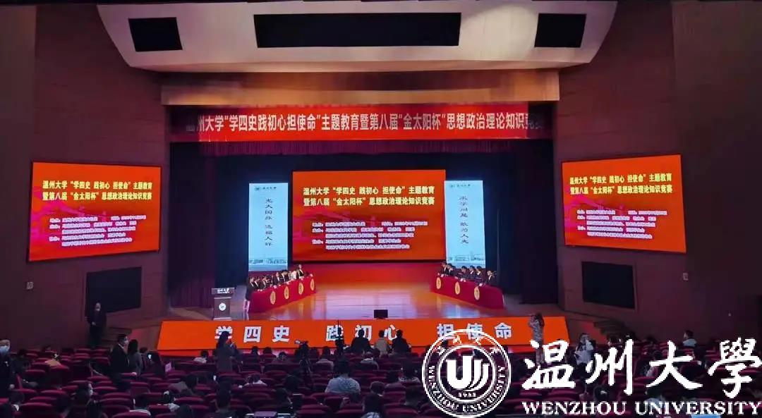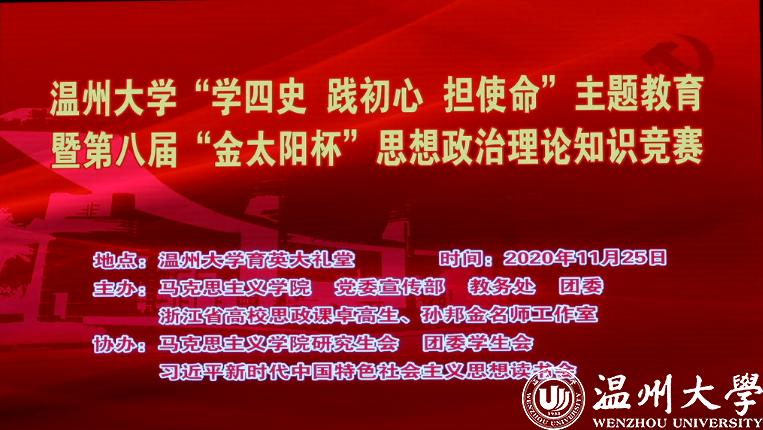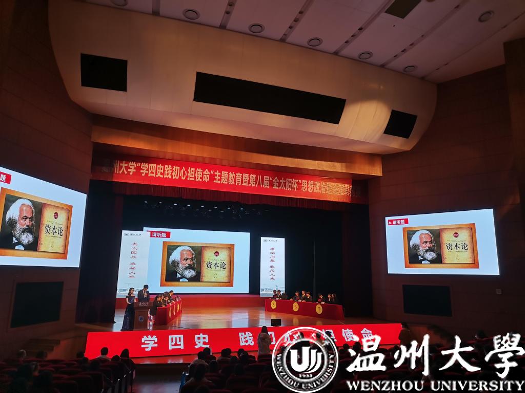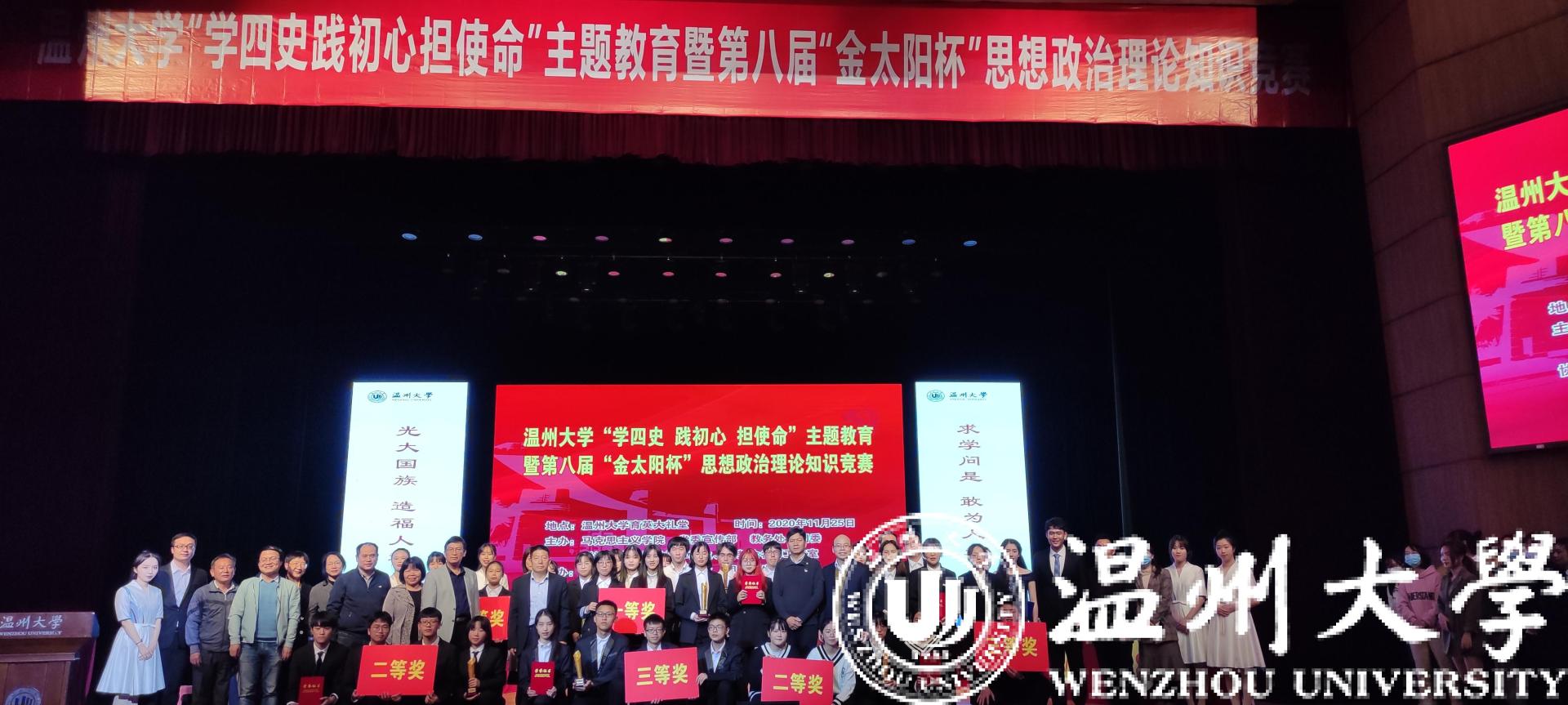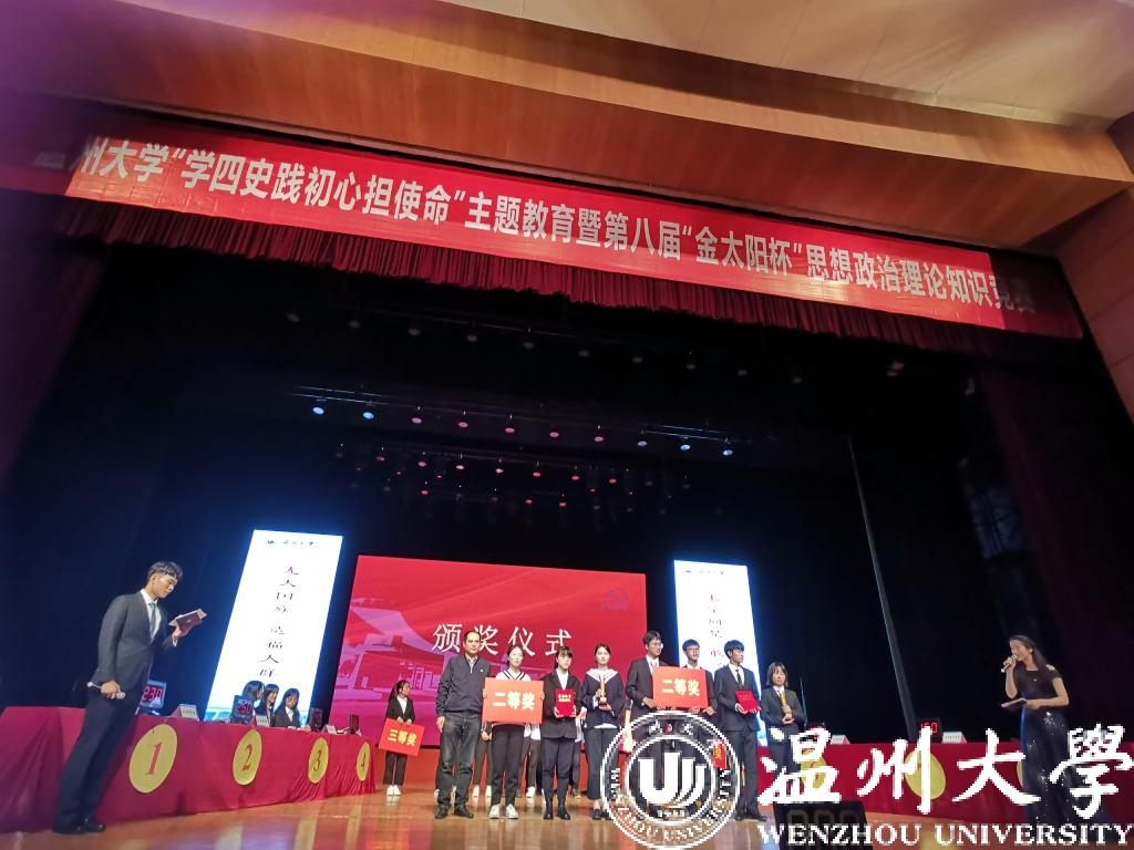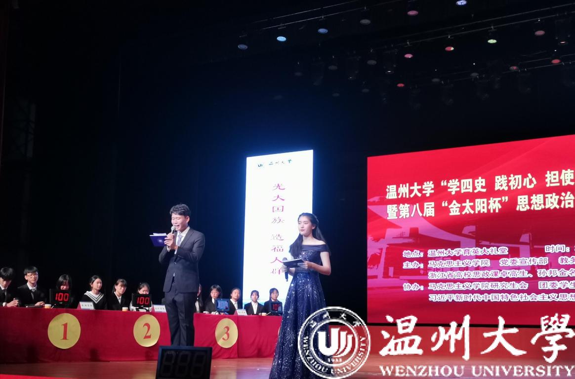 历史是最好的教科书,也是最好的清醒剂。今年是中华人民共和国成立七十一周年和决胜全面建成小康社会的收官之年,明年我们即将迎来伟大的中国共产党成立100周年。值此之际,为深入学习贯彻习近平新时代中国特色社会主义思想,特别是习近平总书记关于党史、新中国史、改革开放史、社会主义发展史的重要论述,检验大学生对“四史”知识掌握程度, 11月25日,黑料不打烊 “学四史 践初心 担使命”主题教育暨第八届“金太阳杯”思想政治理论知识竞赛在黑料不打烊 育英大礼堂隆重举行。本次竞赛活动由黑料不打烊 ,党委宣传部,教务处,团委,浙江省高校思政课卓高生、孙邦金名师工作室联合主办,由马克主义学院研究生会、习近平新时代中国特色社会主义思想读书会协办。黑料不打烊 党委副书记庄兴忠,党委委员、宣传部部长潘玉驹,校纪委副书记、纪检监察室主任杨立淮,教务处处长孙芙蓉,团委书记易招娣,黑料不打烊 党委书记王柏民,院长卓高生,副院长孙邦金,副书记叶柏霜等领导亲临现场指导,并为获奖队伍颁奖。