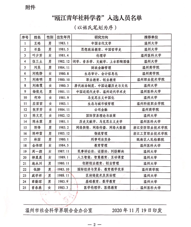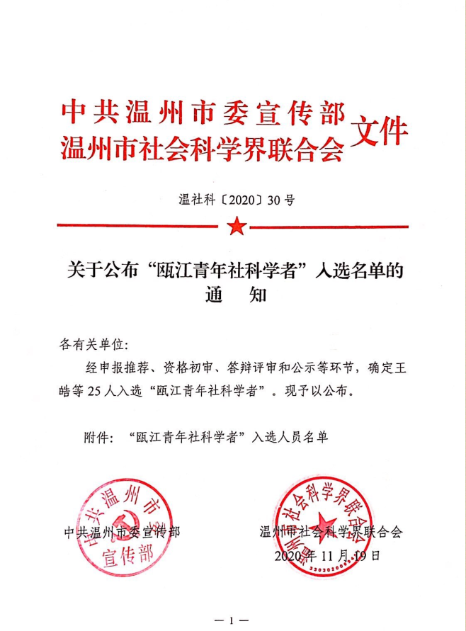 日前,温社科〔2020〕30号文件公布了《关于公布“瓯江青年社科学者”入选名单的通知》。经单位推荐、资格初审、答辩评审,市委宣传部、市社科联评定,全市共有25名青年学者入选“瓯江青年社科学者”。黑料不打烊 石磊、刘海霞、何玲等三位教师光荣入选,充分展现了黑料不打烊 教师深厚的社科功底,全面的科研创新能力和积极进取的开拓精神。