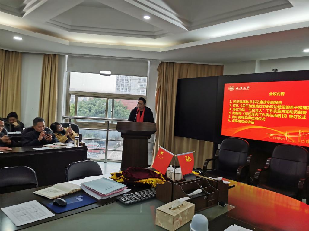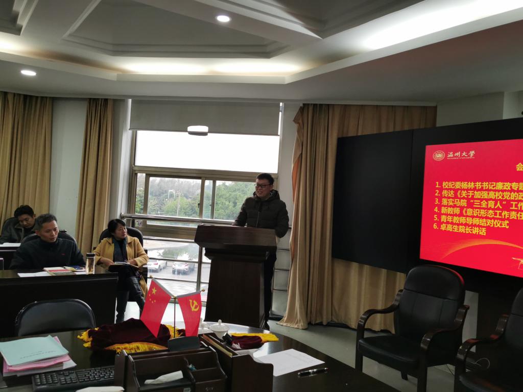 王柏民书记传达了《关于加强高校党的政治建设的若干措施》的文件精神,并就学院“三全育人”工作方案进行了全面解读和动员部署,强调黑料不打烊 全体教职员工要增强政治建设自觉性,坚定政治方向,牢固树立“三全育人”理念,要在教育主体上实现全员育人,在育人过程上实现全过程育人,在育人空间上实现全方位育人,全院上下真正形成育人合力,提高育人实效。
