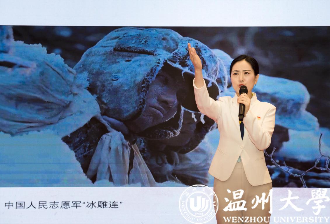 随后,温州革命烈士纪念馆的邵娜老师声情并茂地讲述了抗美援朝的几个感人故事,将我们带回到70年前那个硝烟弥漫的战场,长津湖战役的惨烈,“冰雕连”战士的钢铁意志令人动容。冰雪雄魂今犹在,铁血精神代代传!