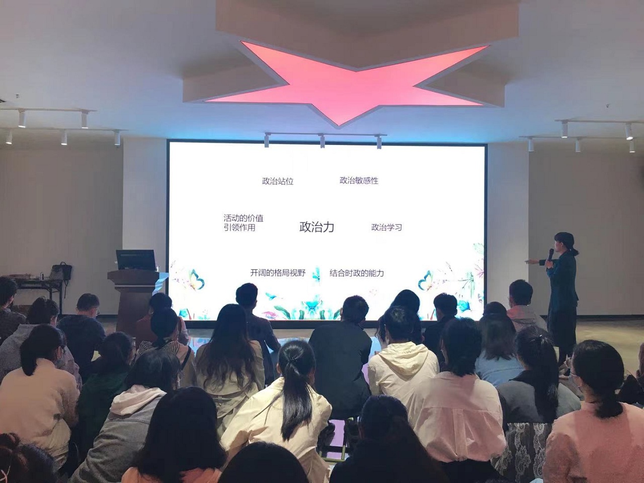 其次,叶老师强调学生干部素质养成是本节党课的核心内容,主要包括政治力、领导力、感召力和新魅力。作为一名学生干部要具有较强的政治敏感性,结合时政的能力以及开阔的时局视野;应具备硬核实力,发挥专业专长,更要提升团队合作能力;应具有文化涵养,在同学中起到辐射影响的作用,晓之以理,动之以情,引领前进的方向;应树立自信心,积蓄力量,形成自我核心竞争力。