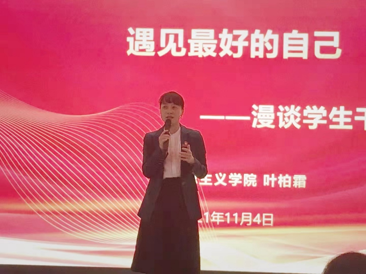 会上,叶柏霜老师就学生干部如何策划活动提出了三点要求:一是精心谋划,通盘考虑。举办活动的首要前提是确立活动要达成的目标,即把目标达成度放在首位。同时,学生干部们要学会着眼于团队核心作用;进行科学有效地分工,着力处理好细节;提高应对突发情况的能力;强化校园网、微信公众号等平台的宣传报道功能。二是精准实施,有效执行。叶老师认为,作为学生干部在举办大型活动时要保持责任感和忠诚度,注重场地、时间等信息的动态变化、及时传达与精准对接,做到眼观六路,耳听八方。三是精细总结,反观成效。她赠予同学们三句话:每一次的瑕疵,都是为了遇见下一次的完美;脚步走不到,目光要达到,目光达不到,梦想要达到;星光不负赶路人,带着情怀去总结。