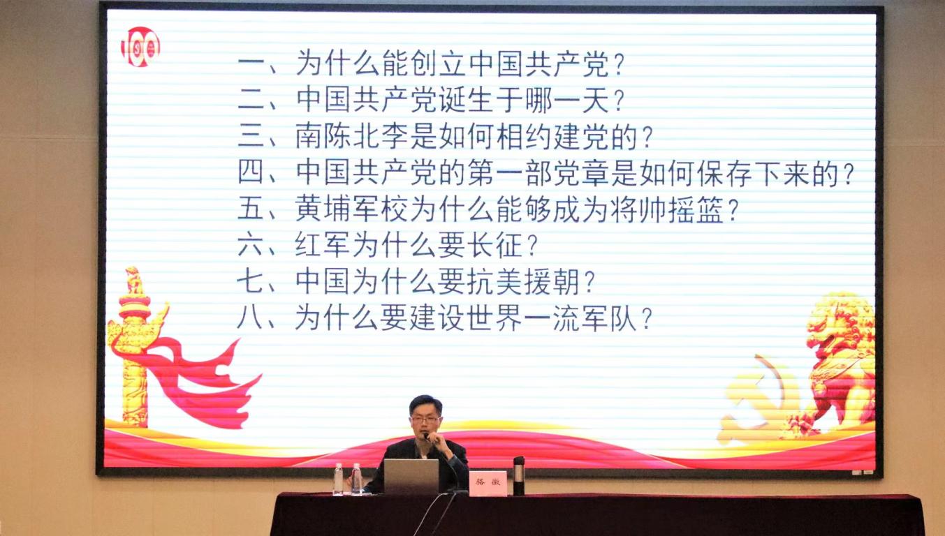 骆徽老师围绕“为什么能创立中国共产党?”“中国共产党诞生于哪一天?”“南陈北李是如何相约建党的?”“中国共产党的第一部党章是如何保存下来的?”“黄埔军校为什么能够成为将帅摇篮?”“红军为什么要长征?”“中国为什么要抗美援朝?”“为什么要建设世界一流军队?”等问题展开讲解,深刻地了解党的光辉历程。通过学习“百年党史”,我们要真正深刻认识到红色政权来之不易、新中国来之不易、中国特色社会主义来之不易,认识到只有社会主义才能救中国,只有社会主义才能发展中国,只有坚持和发展中国特色社会主义才能实现中华民族的伟大复兴。