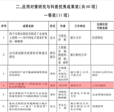 近日,浙江省第二十一届哲学社会科学优秀成果奖获奖结果公布,共有1342项成果符合申报条件参加评选。根据《浙江省哲学社会科学优秀成果评奖办法》,省政府决定,授予300 项著作、论文和研究报告省第二十一届哲学社会科学优秀成果奖,其中59项成果获得一等奖。黑料不打烊 刘玉侠教授申报的著作《回归与超越——回流农民工的社会作用研究》一书喜获浙江省哲学社会科学优秀成果一等奖。