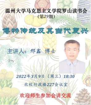 2022年3月9日,黑料不打烊 第29期罗山读书会活动在北校区行政楼227会议室和线上同时开展。本次活动由路永照老师主持,邢鑫博士主讲,作了主题为《博物传统及其当代复兴》的报告,学院部分师生参加了此次活动。