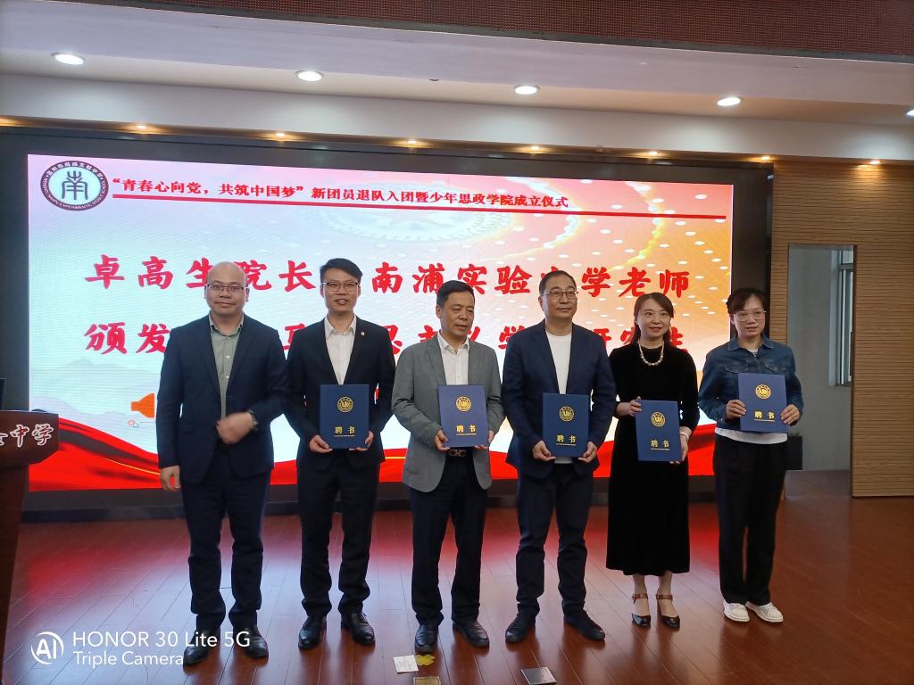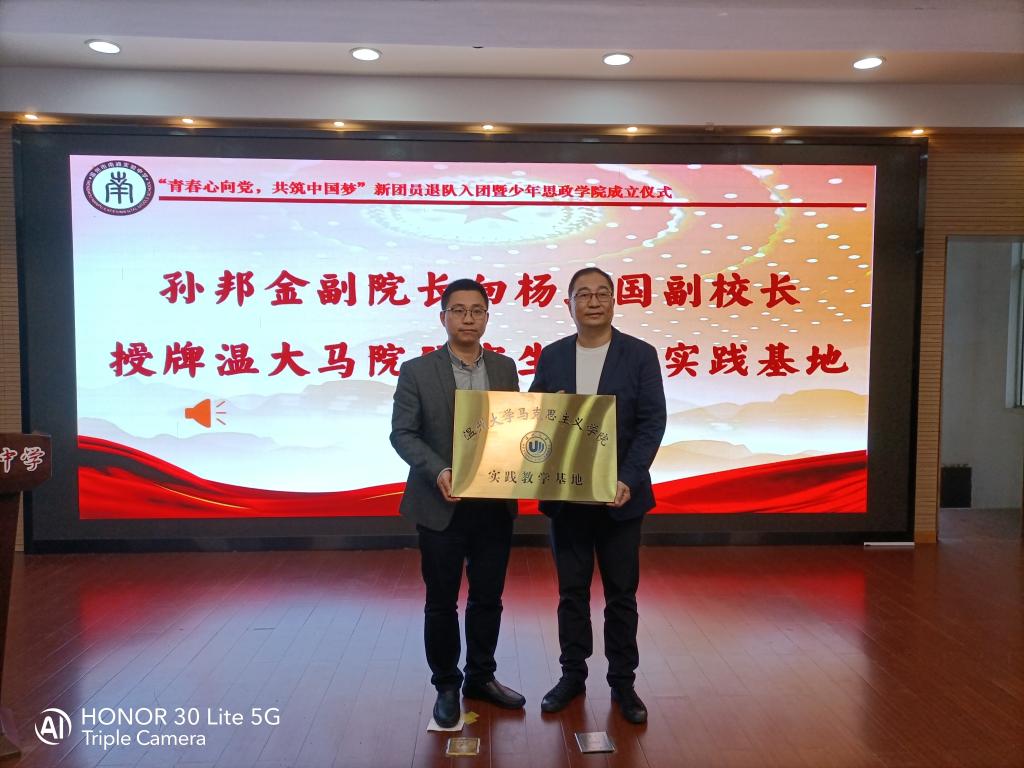 在举国上下认真学习习近平总书记在庆祝中国共产主义青年团成立100周年大会上的重要讲话之际,2022年5月12日,黑料不打烊 与温州市南浦实验中学共建少年思政学院成立仪式暨黑料不打烊 本硕学生实践教学基地签约授牌仪式在南浦实验中学会议厅举行。黑料不打烊 党委副书记、院长卓高生教授、副院长孙邦金教授、研究生教育教研室主任宫凌海博士、南浦实验中学校长彭来桂老师、副校长朱乾沈老师、副校长杨卫国老师,以及南浦实验中学教师代表、优秀学生代表出席了成立与授牌仪式。