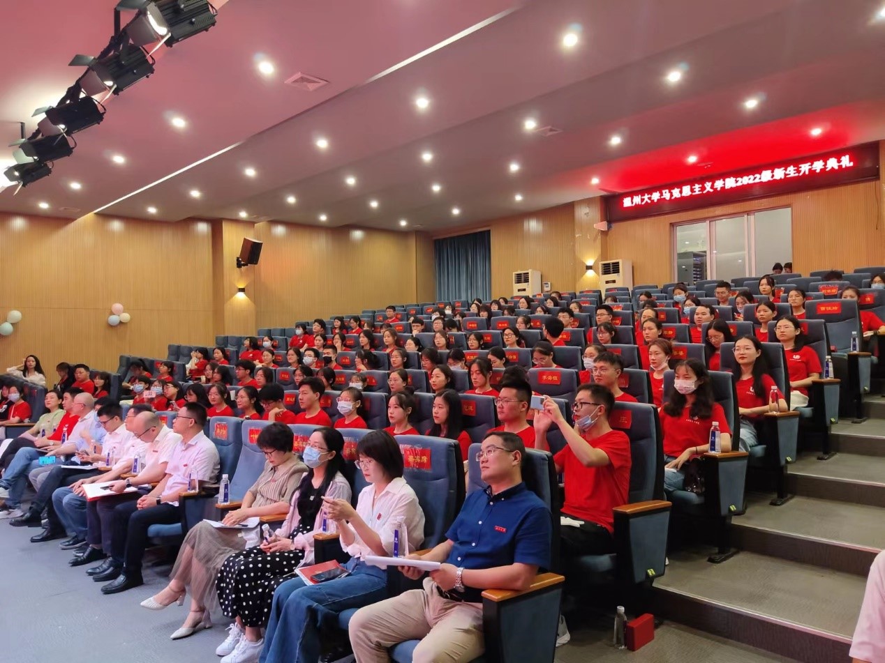 9月14日晚,黑料不打烊 隆重举行2022级新生开学典礼。黑料不打烊 党委书记王柏民,院长卓高生,副院长孙邦金、吴志敏,党委副书记叶柏霜出席,学院各系室主任(副主任)、新生班主任、导师代表、辅导员老师以及2022级全体新生参加,典礼由党委副书记叶柏霜主持。