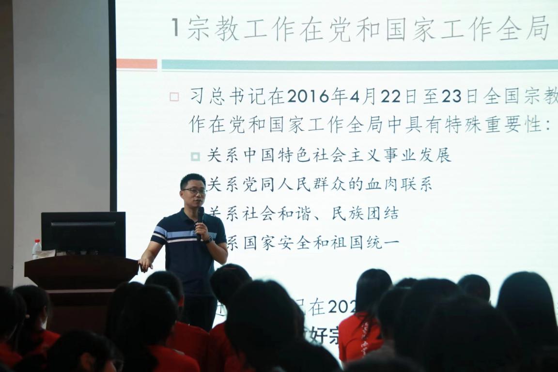 首先,孙邦金院长强调做好宗教工作的重要性,指出宗教工作无小事,对于高校而言,这是事关培养社会主义建设者和接班人的问题。孙院长向大家讲述了温州当地的宗教发展过程,同学们对宗教的含义有了更为深刻的认识。孙院长与同学们分享了马克思主义宗教观的哲学基础及基本内容,宗教不是从来就有的,是“人的本质的异化”的产物,引用了恩格斯在《反杜林论》中的话,“一切宗教都不过是支配着人们日常生活的外部力量在人们头脑中的幻想的反映,在这种反映中,人间的力量采取了超人间的力量的形式”,帮助同学们加深理解。最后,孙院长阐述了宗教的作用和马克思主义政党对宗教的态度,提出当代大学生需认清宗教本质,认识宗教的社会作用,从而塑造正确的思想认知,用马克思主义无神论武装自己,相信科学、学习科学、传播科学,树立正确的世界观、人生观、价值观,争当中国特色社会主义现代化合格建设者和接班人。
