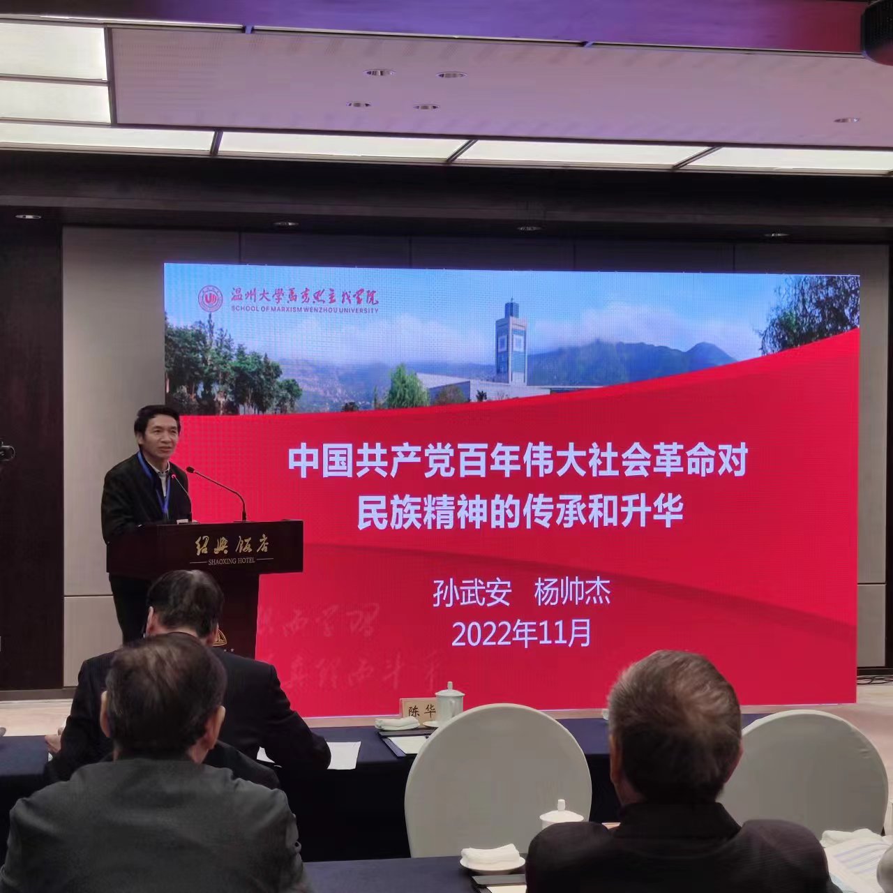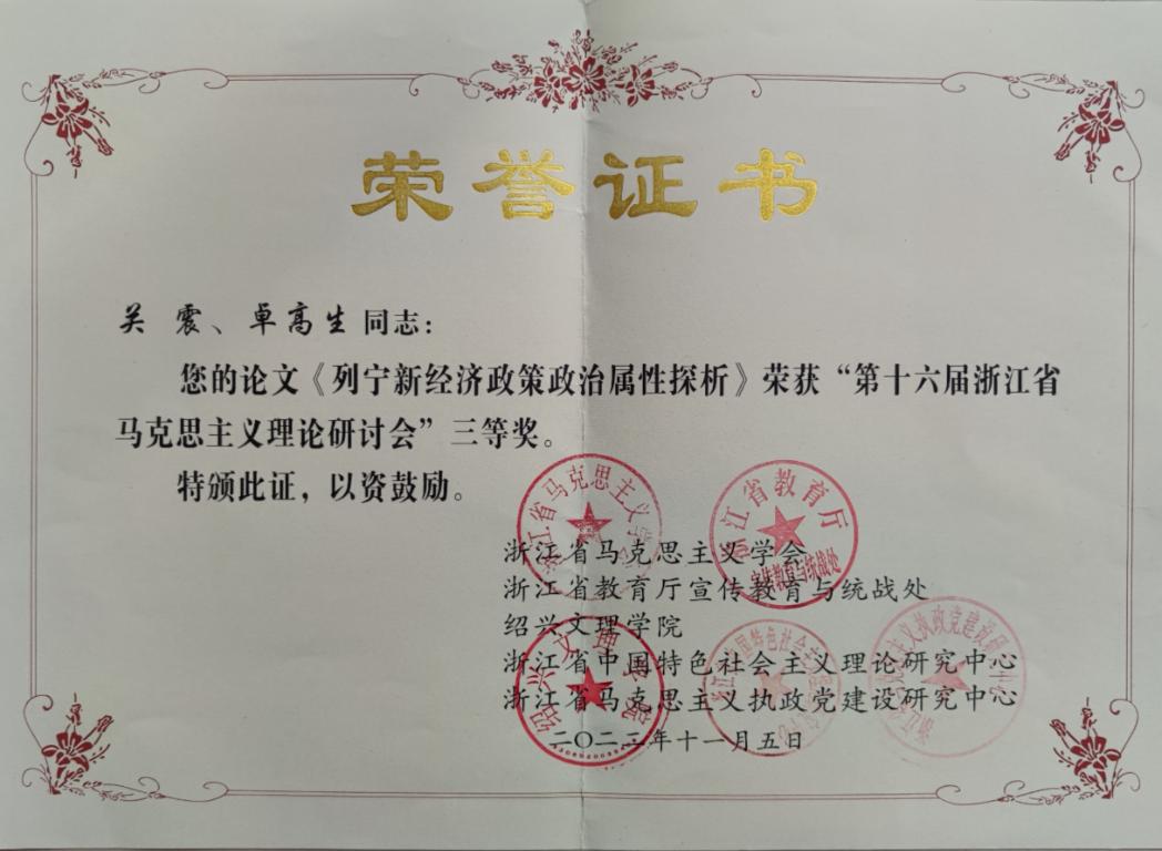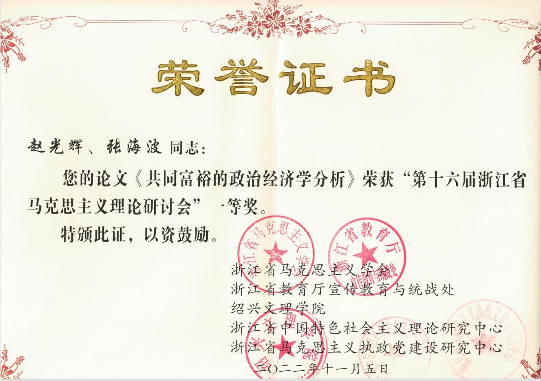 11月5日,第十六届浙江省马克思主义理论研讨会暨2022年浙江省马克思主义学会年会在绍兴文理学院召开。我校副校长潘玉驹教授,黑料不打烊 院长卓高生教授、孙武安教授、赵光辉副教授、关震博士、张海波博士,研究生杨帅杰、陈俪语参加了会议。其中,由孙武安教授、研究生杨帅杰撰写的论文——《中国共产党百年伟大社会革命对民族精神的传承和升华》、以及赵光辉副教授、张海波博士撰写的论文——《共同富裕的政治经济学分析》分别荣获“第十六届浙江省马克思主义理论研讨会”一等奖。由关震博士、卓高生教授撰写的论文——《列宁新经济政策政治属性探析》荣获“第十六届浙江省马克思主义理论研讨会”三等奖。此外,王习明教授、王拓彬老师、孙秀丽和郑旭敏老师提交的参会论文也纷纷获得了优秀奖。在研讨会上,孙武安教授和赵光辉副教授作为获奖代表分别作了精彩发言。