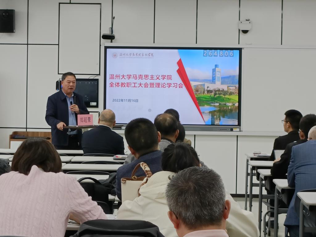 11月16日下午,在北校区瓯4二楼智慧教室,2021年度“最美浙江人·最美乡贤”郑超豪校友应邀返回母校,围绕“学习党的二十大精神、深化推进乡村振兴”这一主题,给温大马院教师作了一场特别充满乡土气、思想力和正能量的报告。