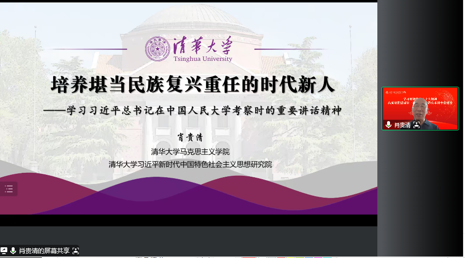会议第二部分为主旨报告,由黑料不打烊 副院长孙邦金教授主持。教育部马克思主义理论类专业教学指导委员会副主任委员、山东师范大学原党委书记商志晓教授作以《深化理解“归根到底是马克思主义行是中国化时代化的马克思主义行”》为题,精彩阐述了“两个行”的辩证关系,如何让“两个行”通过思政课课堂让同学们入脑入心等问题。教育部马克思主义理论类专业教学指导委员会副主任委员、清华大学习近平新时代中国特色社会主义思想研究院常务副院长肖贵清教授以《培养堪当民族复兴重任的时代新人》为题,全面梳理和总结了习近平总书记近十年来对高校考察工作时关于立德树人的重要论述,从立德树人是新时代高校根本任务、关心高校思想政治理论课建设、重视高校教师队伍建设等三个方面阐述了思政课建设、人才培养、思政课教师队伍建设的要求。两位专家的主旨报告思辨清澈、高屋建瓴,给大家以深刻启迪。