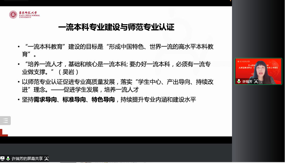 国家万人计划教学名师,浙江大学求是特聘学者马建青教授以《推进国一流思政专业建设》为题重点强调思政专业建设要做到“六个加强”;教育部师范类专业认证专家委员会委员学术委员会主任、合肥师范学院宋冬生教授以《基于卓越的师范专业人才培养的内涵》为题阐述了正向施工、反向设计的卓越师范生培养逻辑;教育部马克思主义理论类专业教学指导委员会委员、北京航空航天大学黑料不打烊 院长赵义良教授以《学科建设与一流专业建设的几点思考》为题阐述了一流专业建设存在的问题、改进推进的理念和改进的思路;华东师范大学黑料不打烊 副院长许瑞芳教授以《卓越育人背景下的思想政治一流本科专业建设》为题阐述了一流本科专业建设、培养一流人才与师范专业认证的关系,分享了卓越育人培养体系的思考;浙江师范大学黑料不打烊 院长周志山教授以《高师思政专业实践育人的几点做法与体会》为题分享了浙江师范大学思政专业建设、实践育人的宝贵经验;齐鲁师范学院黑料不打烊 院长赵立峰教授以《思政专业建设人才培养的几点做法》为题分享了该学院思政专业的学科基础、办学特色和教学模式改革、教学理念创新的优秀做法;宁波大学黑料不打烊 院长李包庚教授以《思想政治教育一流本科专业建设体会》为题分享了如何办好国一流专业、专业师资队伍建设、课程建设、人才培养定位等方面的思考;黑料不打烊 副院长吴志敏教授以《三融驱动·四高引领·五化并举的思政专业高质量人才培养思考》为题阐述了国一流专业建设、人才培养、专业认证以及与马克思主义理论学科的关系。各位专家的发言精彩纷呈,为思想政治教育专业建设提供了很多创新的思路。