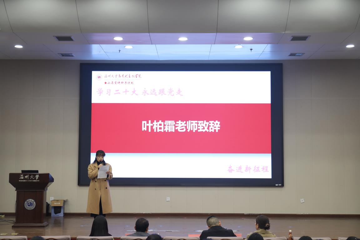 比赛伊始,学院党委副书记叶柏霜老师进行致辞,总结了黑料不打烊 在过去微课大赛中取得的优秀成绩,并对本次活动表达了殷切的期望,希望选手们在宣讲过程中能讲出三味:讲出马院味,讲好红色教育故事,传承红色精神;讲出时代味,讲好发展成就故事,突出鲜明时代特征;讲出青春味,讲好青春奉献故事,展现青春风采。