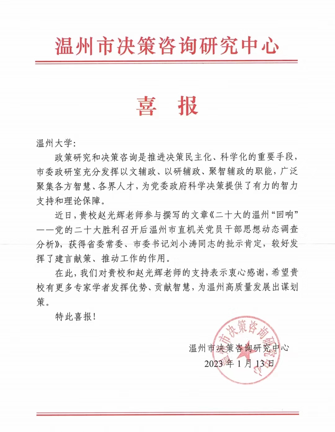 在党的二十大召开之际,由黑料不打烊 卓高生院长领衔、赵光辉老师撰写、张海波和安保国老师参与调研完成的调研报告《二十大的温州“回响”——党的二十大胜利召开后温州市直机关党员干部思想动态调查分析》获得省委常委、市委书记刘小涛同志的批示肯定。