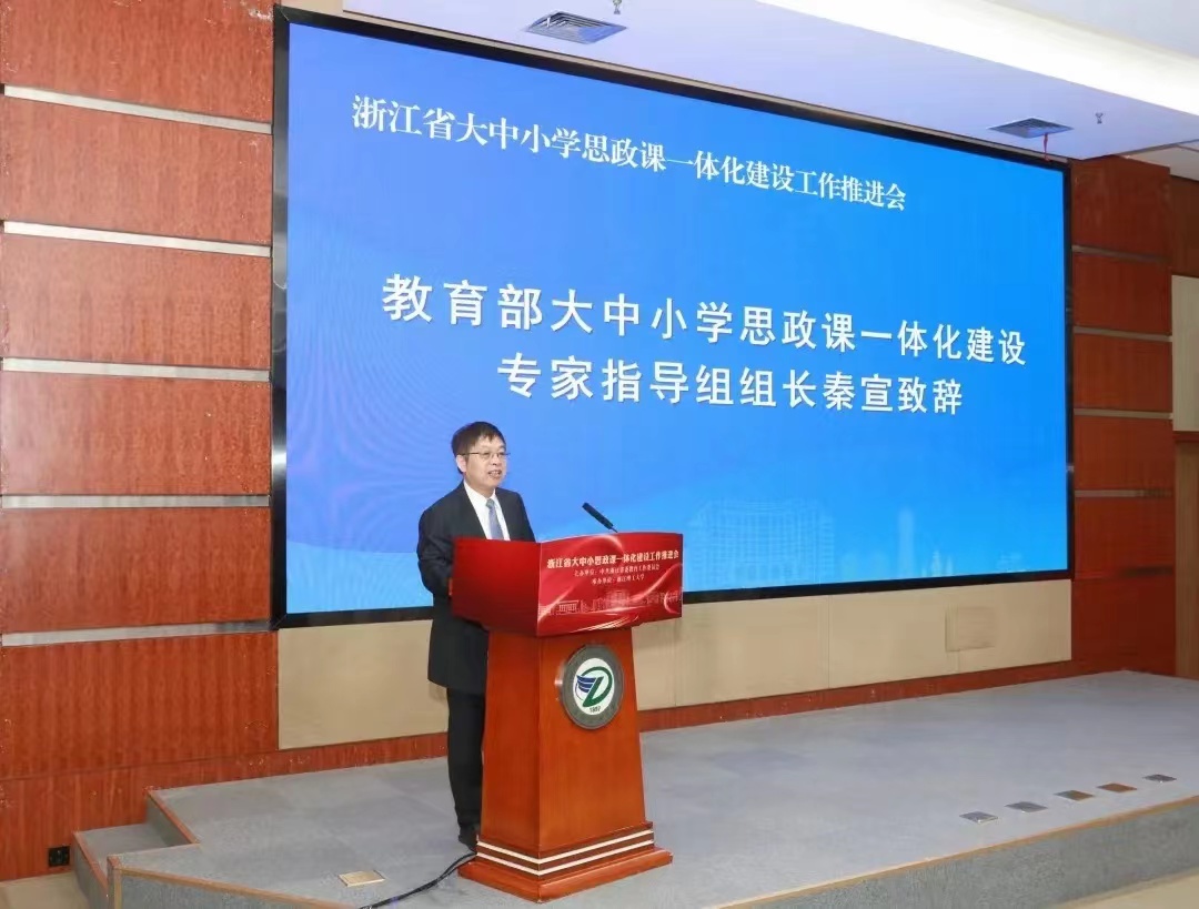 秦宣在致辞中表示,浙江省委教育工委组织召开大中小学思政课一体化建设工作推进会,成立一体化建设联盟,是贯彻落实习近平新时代中国特色社会主义思想的有力举措,是落实教育部关于开展大中小学思政课一体化共同体建设要求的务实之举。他期待浙江大中小学思政课一体化建设结出丰硕成果,为全国做出先行示范。