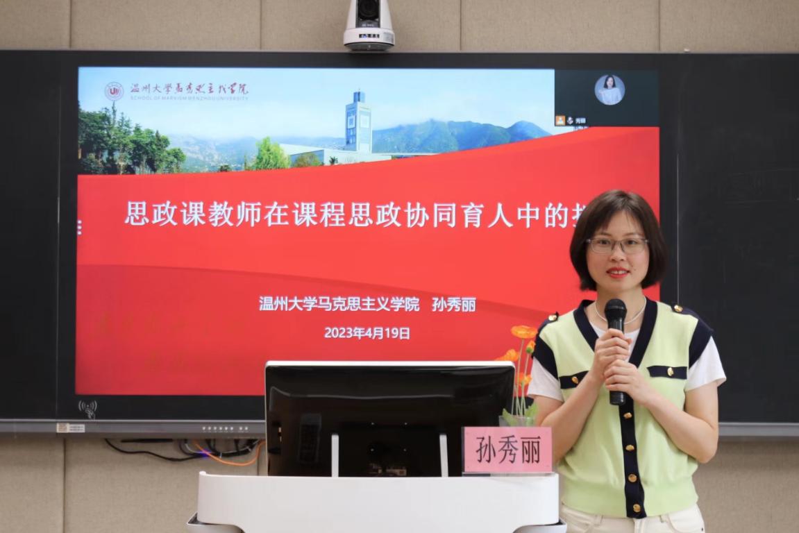 孙秀丽老师以《高校思政课教师在课程思政协同中的担当》为题,重点分析思政课教师在课程思政协同育人中担当的应然、实然和何然是什么?并以《思想道德与法治》课为例,指出思政课教师如何助力课程思政建设。