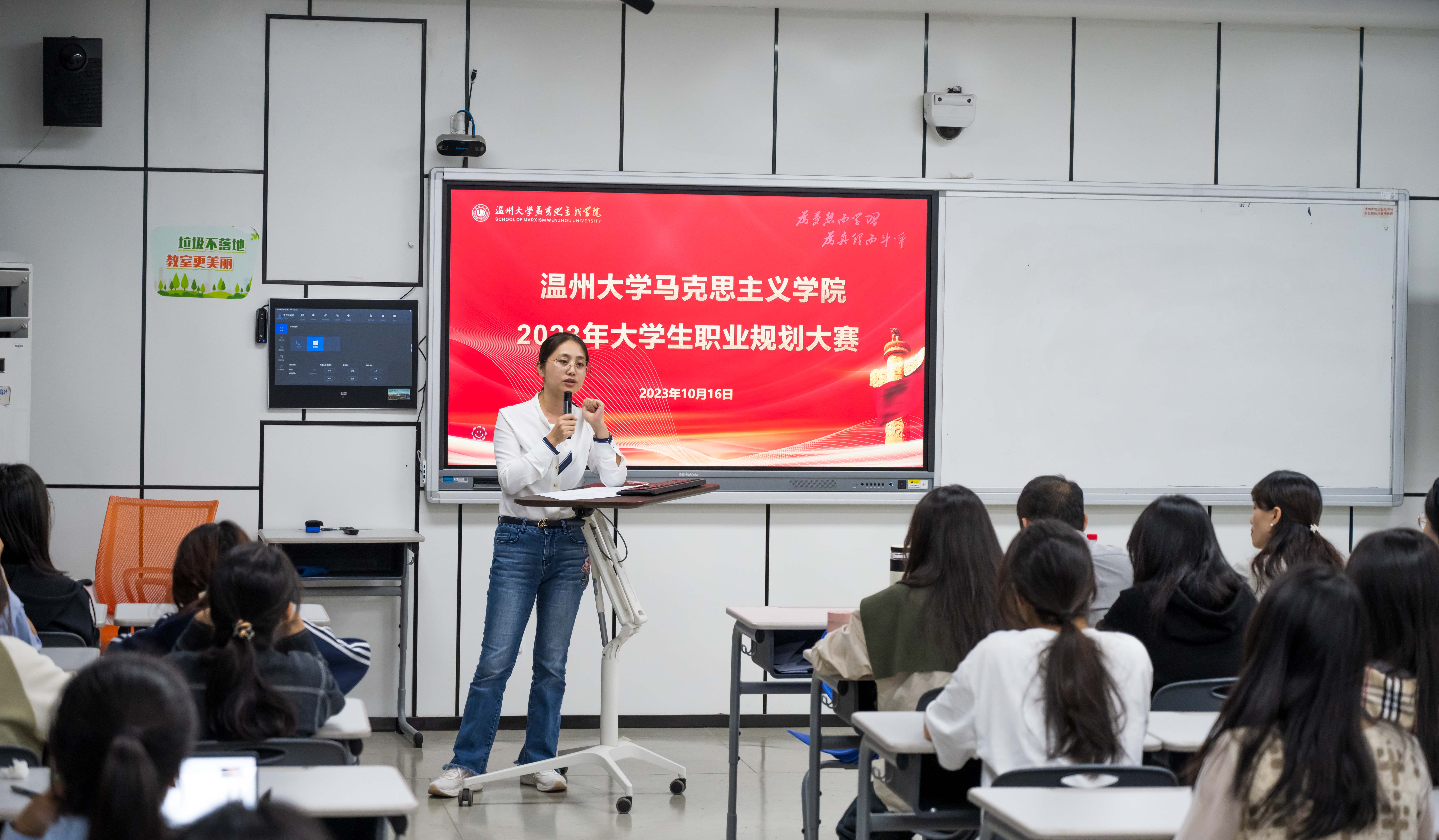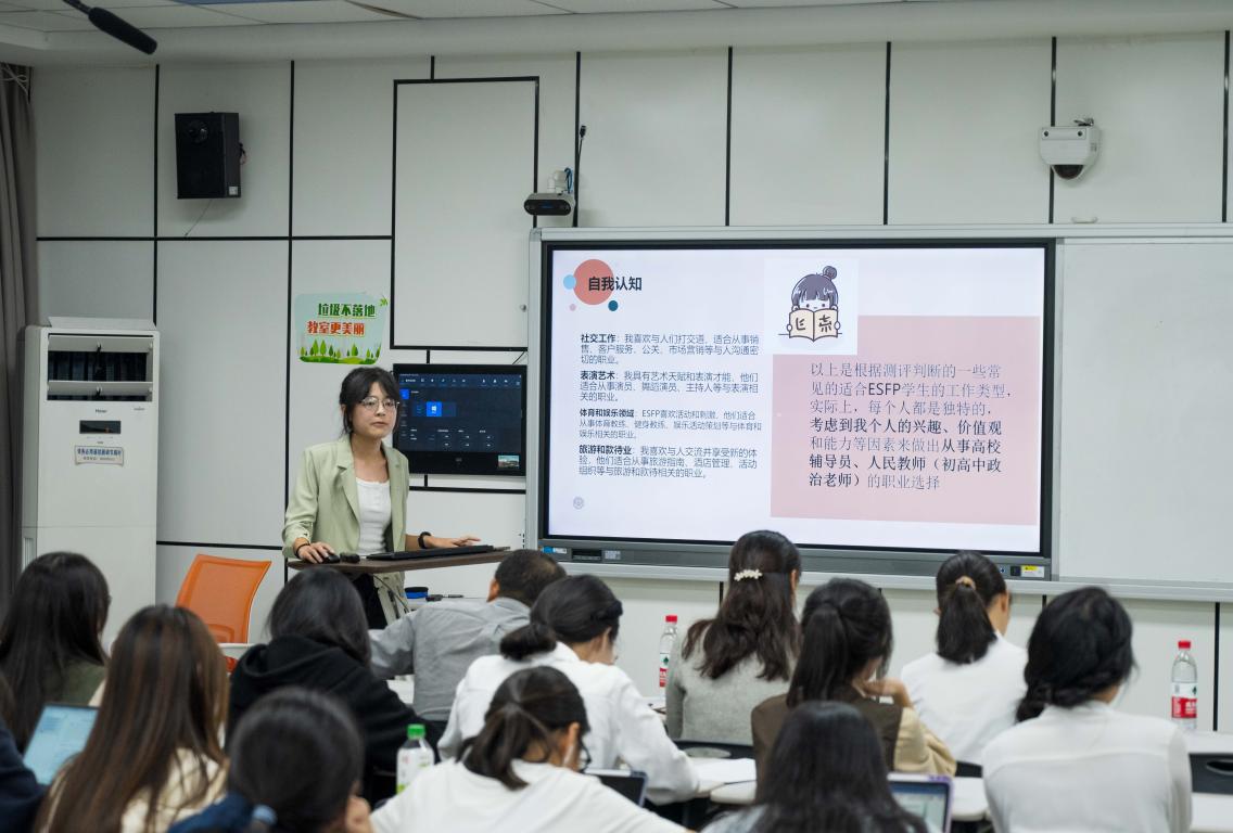 为考察学生个人发展路径与经济社会发展需要的适应度,就业能力与职业目标和岗位要求的契合度,加强大学生职业规划教育和就业指导,2023年10月16日晚6:30,黑料不打烊 在瓯4—204举办了2023年大学生职业规划大赛黑料不打烊 院赛。本次比赛邀请到了黑料不打烊 党委副书记叶柏霜老师、生涯指导老师博士陈爱老师和学工办主任曹开秋老师担任评委。22届政教专业学生来到现场观摩了本次比赛。