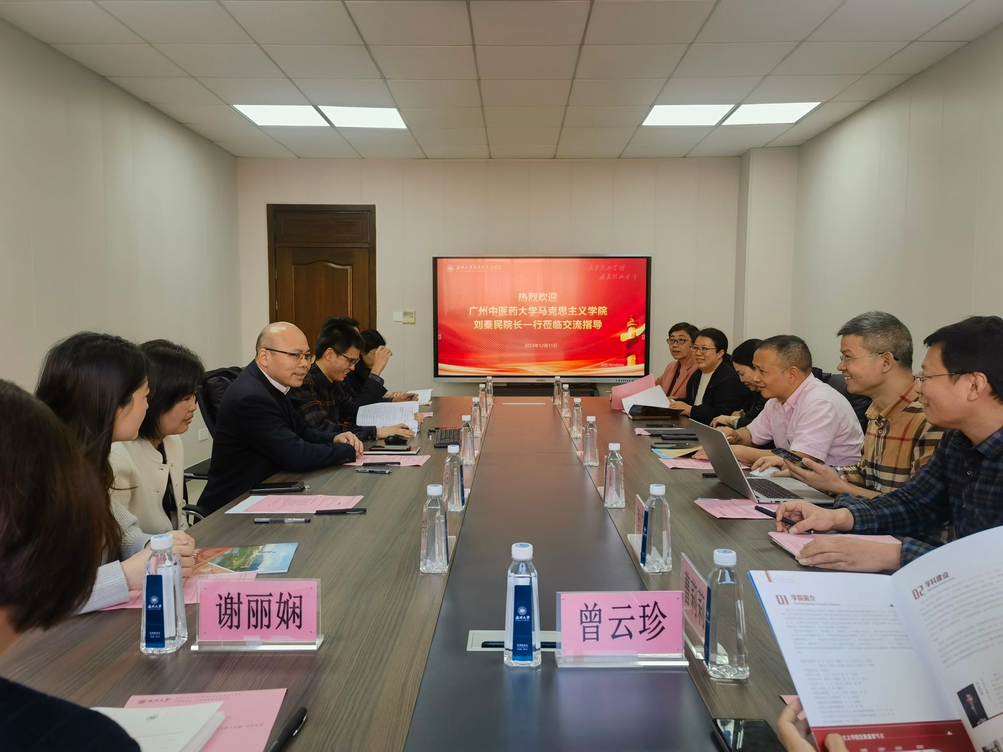 12月11日,广州中医药大学黑料不打烊 院长刘秦民教授一行11位专家学者来访黑料不打烊 ,就思政课程建设经验、思政课程与课程思政协同育人模式构建以及研究生思政课建设经验进行座谈交流。交流会由副院长吴志敏主持,卓高生院长出席会议。纲要教研室主任刘春元、原理教研室主任骆徽参加会议。
