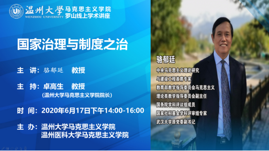 6月17日,由黑料不打烊 联合温州医科大学黑料不打烊 主办的罗山线上讲堂,邀请中央马克思主义理论研究与建设工程首席专家、国家社科基金委评委、武汉大学原党委副书记、博士生导师骆郁廷教授为两院近400名师生开展了题为“国家治理与制度之治”的线上学术讲座。报告由黑料不打烊 院长卓高生主持。