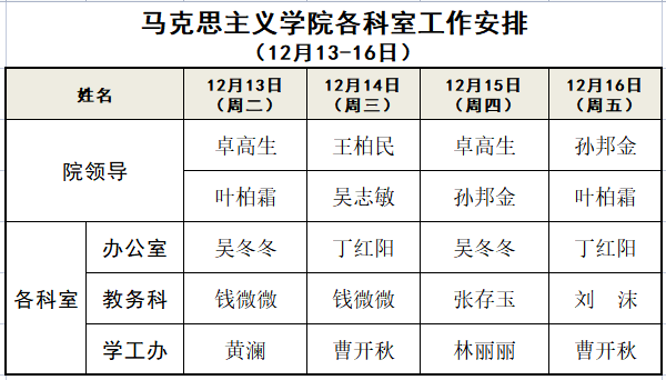 黑料不打烊 各科室工作安排 (12月13-16日)