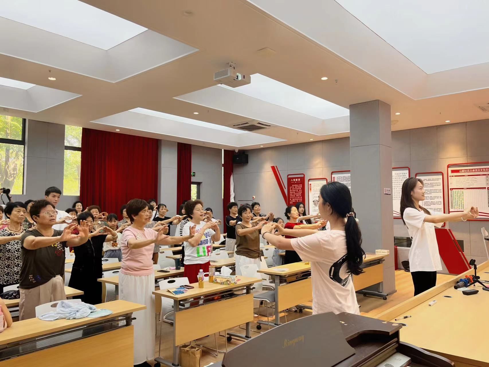 在新桥街道新欧社区里,实践队的李梓煜带领着孩子们随着音乐的节奏唱响了《红星闪闪》等经典歌曲,他们拍打着桌面,随着音乐的律动舞动双手,孩子们用最直接的方式表达了对党的热爱和祝福。同样,在新桥街道山前社区,30多位社区阿姨跟着实践队队员叶籽在音乐中摆动双手。
