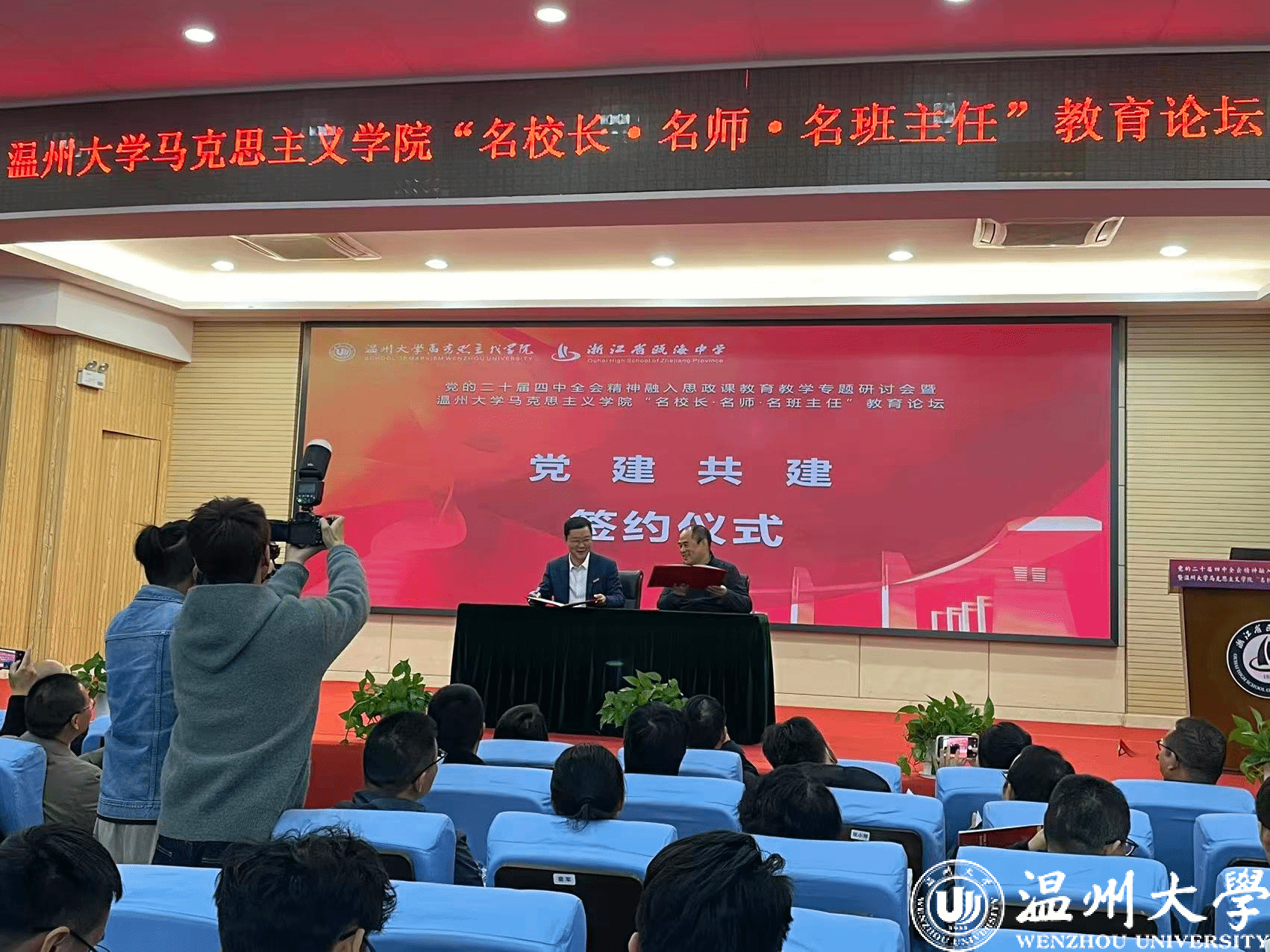现场,还举行了温大马院“名校长·名师·名班主任”教育论坛揭牌仪式,以及温大马院党委与瓯海中学党委的党建共建合作签约仪式,双方将以高质量党建引领高质量发展工作达成广泛共识,商定合作共建项目。同时,与会的名校长、名师、名班主任受聘成为温大马院“三名”教育论坛专家库的首批成员,今后,专家库成员将参与到学院本科生、研究生培养,担任校外实践导师、本科生实习指导师、生涯规划指导师等,通过开设讲座,交流研讨,开展教科研合作,推进大中小思政教育一体化建设等。