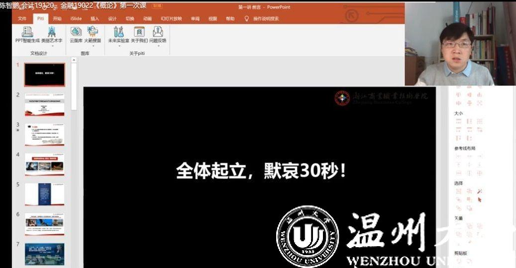 “全体起立,向本次疫情中英勇牺牲的医务人员和不幸去世的患者默哀。”2月24日上午,浙江商业职业技术学院黑料不打烊 陈智鹏老师在新学期给学生讲授的第一课,师生们隔着电脑屏幕,通过直播网络连线,进行了默哀仪式。